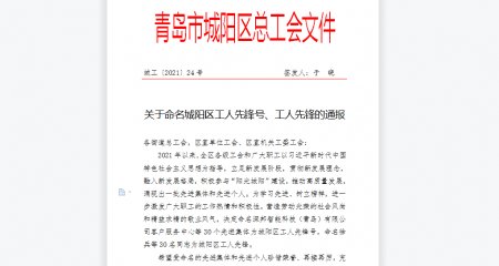 青島正亞機(jī)械喜獲“城陽(yáng)區(qū)工人先鋒號(hào)”稱號(hào)